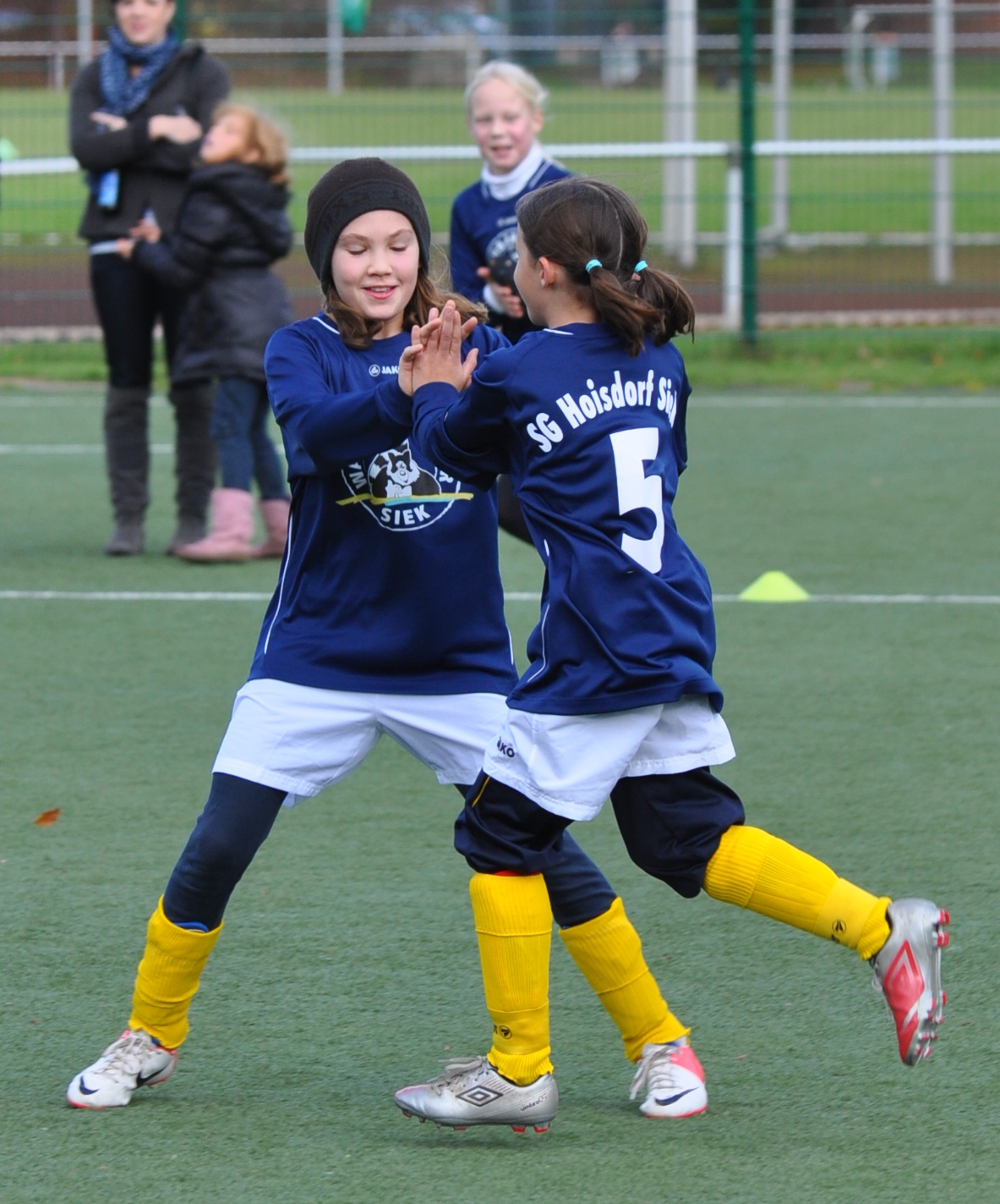 Tabea im Tor war stehts hellwach und konnte alle Aufgaben absolut souverän meistern, in der Abwehr werden Caro und Nele immer mehr zu einem unüberwindbaren Hindernis, unsere starke Abwehr und unsere beiden tollen Torhüterinnen (Melina war Sonntag leider krank), machen oft den Unterschied zu den Gegnerinnen aus. Vivi spielte gestern kurz im Sturm, schoss mal eben zwei Tore und vertrat dann am Ende noch die geschwächt ins Spiel gegangene Nele auf der Verteidigerposition – so sieht Vielseitigkeit aus. Im Mittelfeld ackerten mal wieder Sinah, Wiebke und Amy bis zur Erschöpfung, bereiteten Tore vor oder schossen sie gleich selber (Wiebke und Sinah je eins) und schalteten nebenbei noch die starken Kolleginnen aus der Kreisauswahl aus. Nach der Pause kam dann die ebenfalls angeschlagene Annika im linken Mittelfeld zum Einsatz, erzielte einen Hattrick und fügte sich auch sonst nahtlos in unser Spiel ein – eben eine tolle Fußballerin. Rike und Mia kamen zu guten Einsatzzeiten im Sturm, haben sehr viel Einsatz und Engagement gezeigt und hätten mit etwas mehr Glück fast ein Tor geschossen - weiter so. Ein großes Kompliment geht auch an die junge Schiedsrichterin des FFC. Sie leitete das Spiel absolut fehlerfrei und sehr souverän !