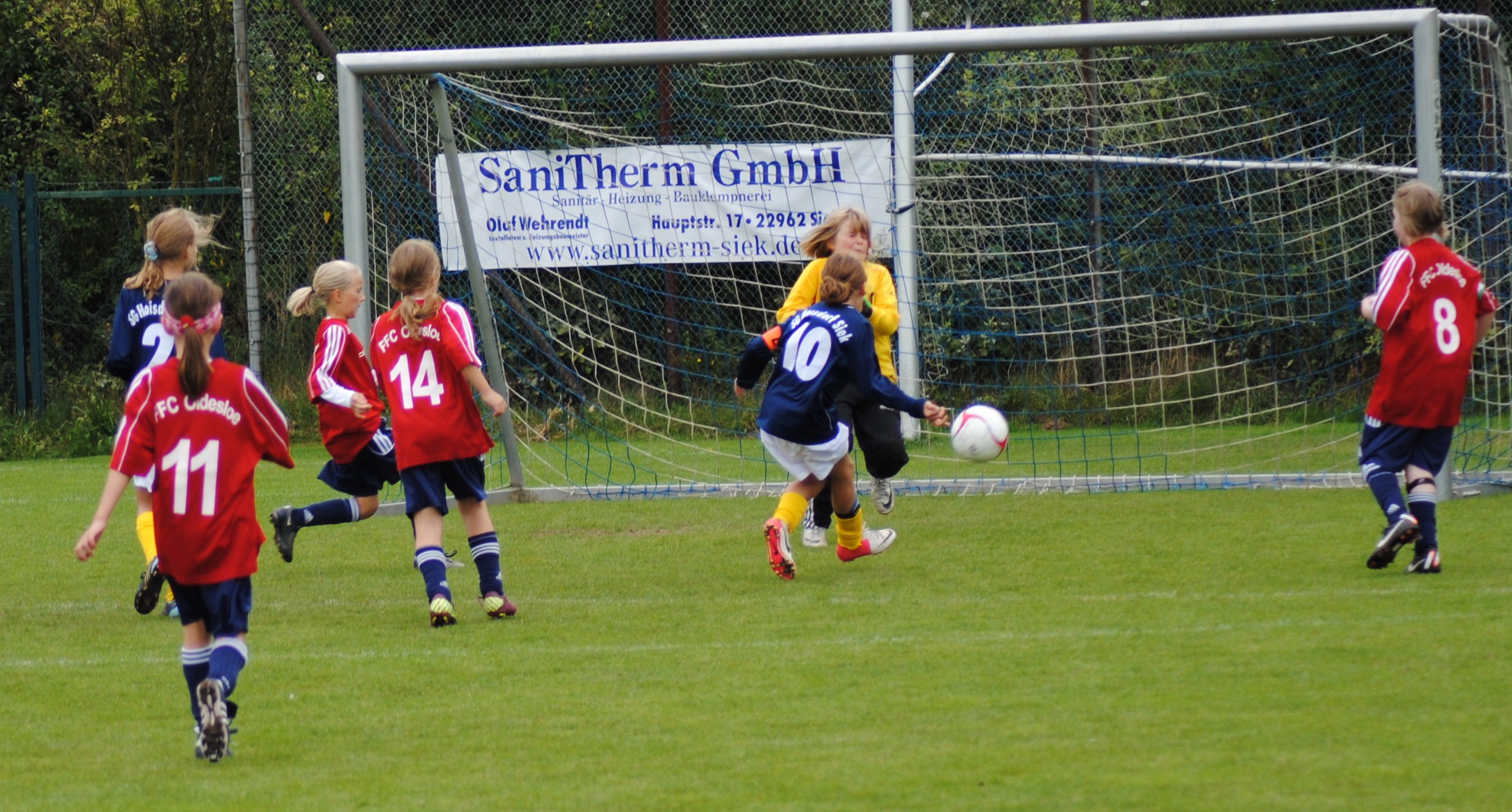 Mit 11:0 wurde der Vorjahresmeister aus Oldesloe nach Hause geschickt (allerdings muss man bedenken, dass viele Spielerinnen der Vorjahresmannschaft aus Oldesloe in die D-Jugend aufgerückt sind) und es war nicht allein die Höhe des Sieges die beeindruckte, sondern auch die Art und Weise wie die Tore herausgespielt wurden. Unsere Mädchen spielten exakt so, wie wir es von ihnen erwartet haben: Saubere Pässe, schnelle Konter und Flügelspiel – besser geht es kaum. Ganze acht Minuten musste der Anhang der SG auf das erste Punktspieltor warten, und es war Sinah vorbehalten dieses zu erzielen, nach schönem Pass von Nina. Bis zur Pause stand es dann durch zwei weitere Tore von Sinah, je einem Tor von Nina und Nele sowie einem Eigentor 6:0. Auch nach der Pause steckten unsere Mädchen nicht zurück und noch zwei Tore von Sinah und drei Tore von Nina bedeuteten den Endstand von 11:0. Es wurde auf unserer Seite fleißig gewechselt und so kamen alle 11 Spielerinnen zu ihrer Einsatzzeit.